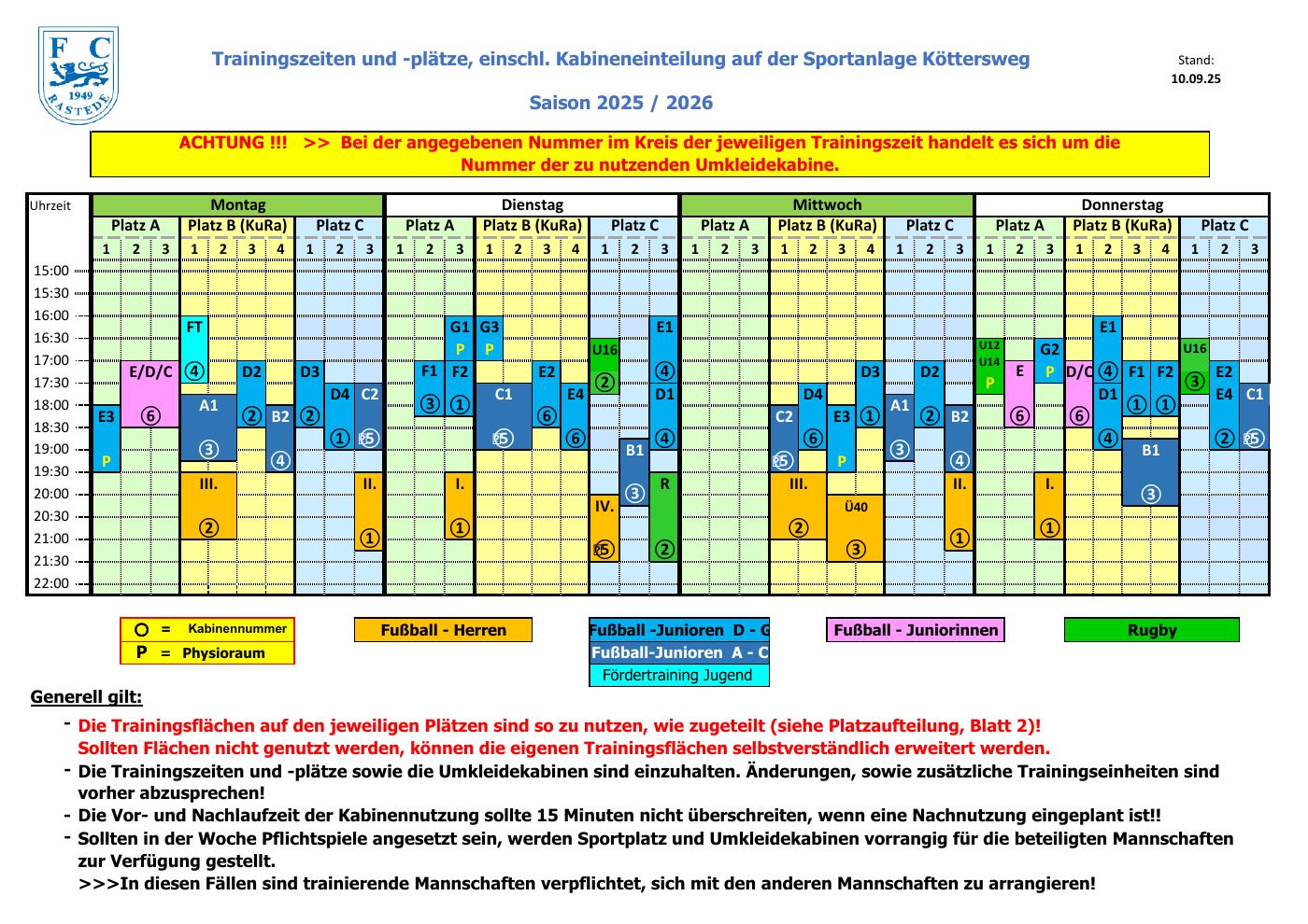 Trainingszeiten und -plätze, einschl. Kabineneinteilung auf der Sportanlage Köttersweg